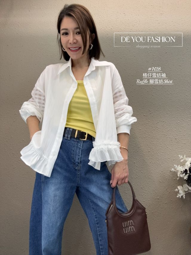 H28 (白) 格仔雪紡袖 Ruffle 腳雪紡Shirt (直播價)