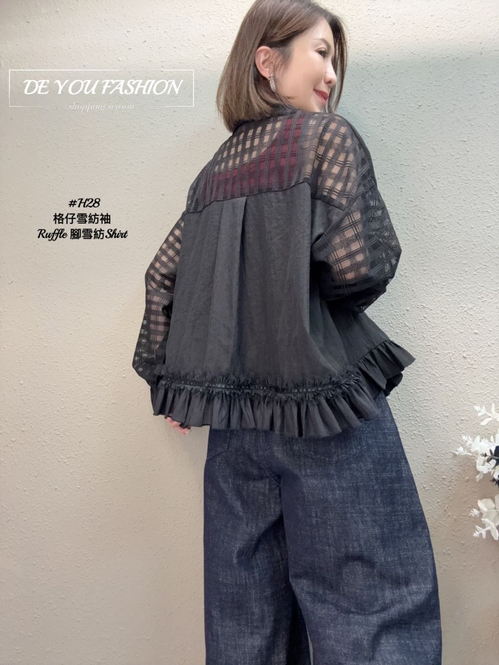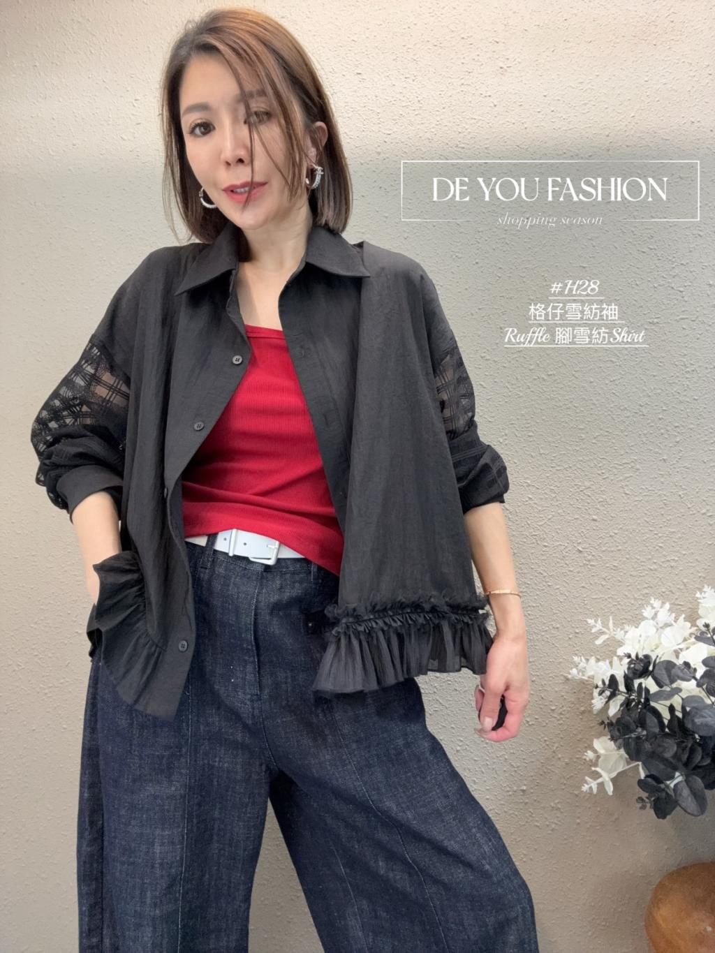 主頁 H28 (黑)格仔雪紡袖 Ruffle 腳雪紡Shirt (直播價)